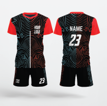 This bold, fully sublimated sports uniform features an electrifying, "Neon Divide" graphic that blends traditional art with futuristic intensity, perfect for any team sport. The jersey's all-over pattern on the black torso is composed of dynamic, flowing lines in contrasting neon red and electric blue, dramatically separated by a clean white vertical stripe on the front. This high-impact graphic is balanced by solid bright red sleeves and a plain black short, which carries a subtle hint of the neon wave pattern on the side panels. Ready for immediate customization, the design offers clear placement for your team logo and uses crisp white numbering/lettering for excellent visibility.